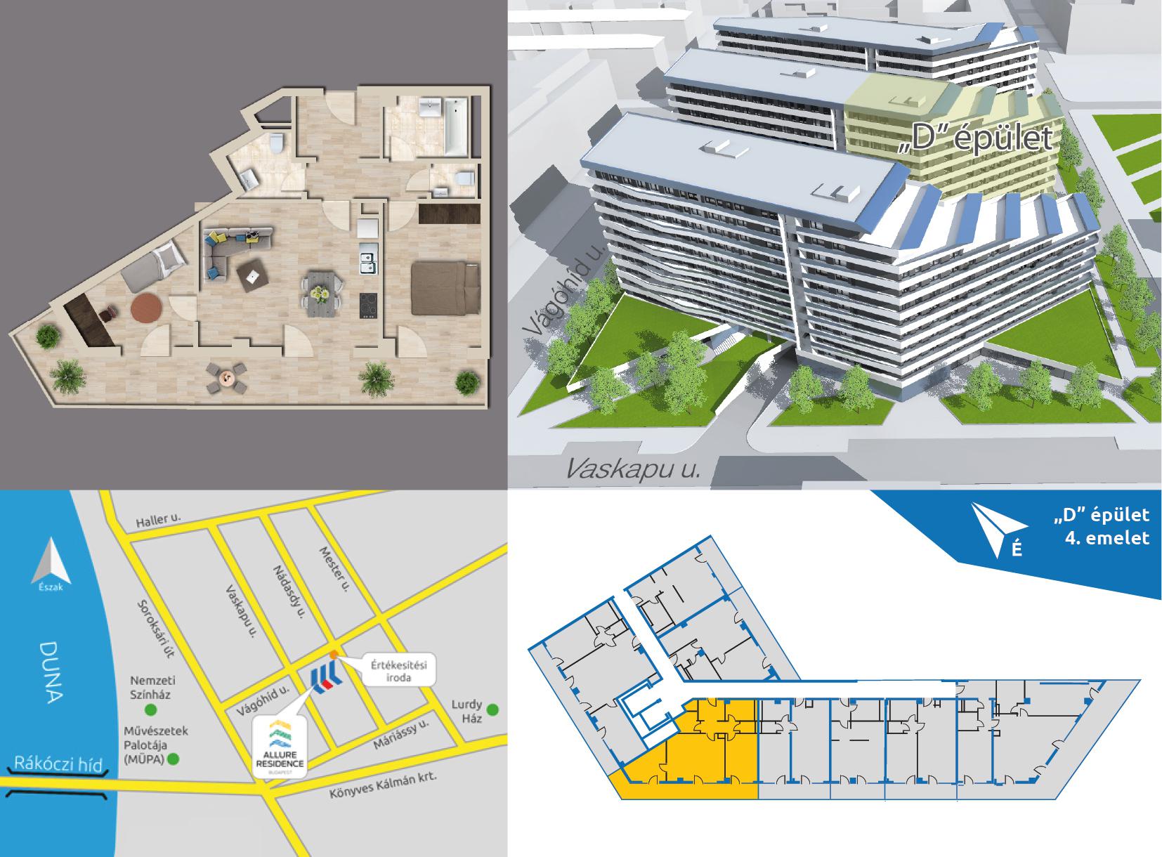 ELADVA! Jól átgondolt alaprajzok, könnyen bútorozható lakások. Az Allure Residence tervezésekor ügyeltünk rá, hogy minden lakás napfényes kialakítású legyen. A lakópark frekventált helyen, a Duna-parttól, a Művészetek Palotájától és a Nemzeti Színháztól egy sarokra épül. A délnyugati tájolású lakások a Máriássy utca felé, míg a keleti tájolásúak a Nádasdy utca felé néznek. A IV. ütem lakásainak ablakaiból a 0-24 órás portaszolgálattal őrzött, zárt és hangulatos belső kert látható.